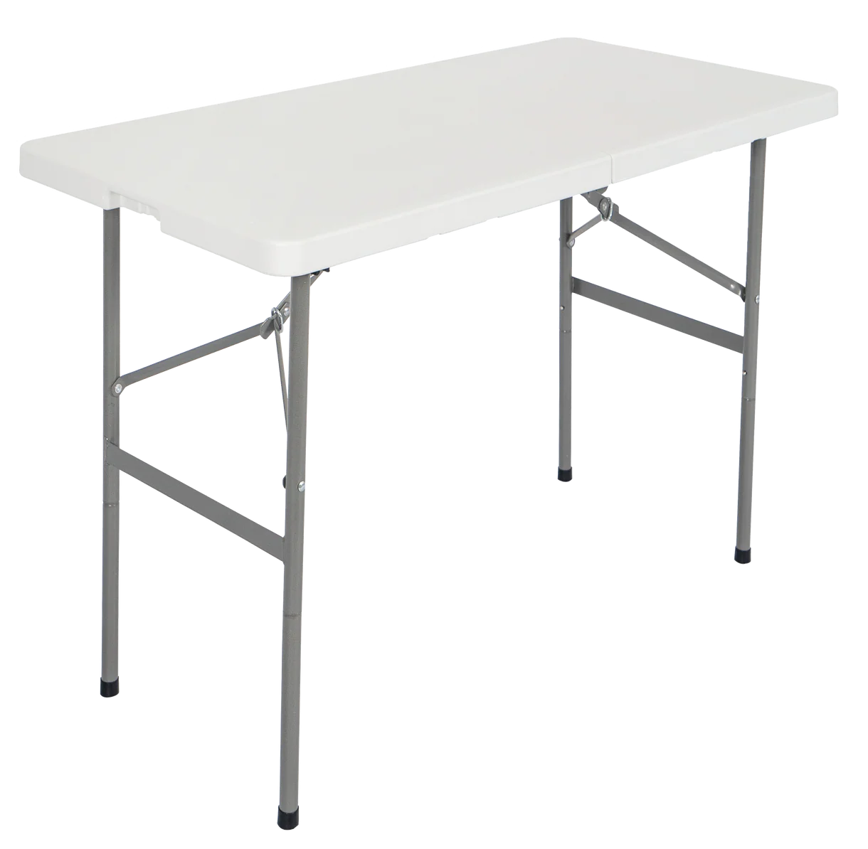This Homer 4ft. Folding Table White open size is 122 x 60 x 74cm. The portable folding table can be used as picnic table for outdoor, side table, serving table for dining, or can serve as camping table for beach and fishing. Finished with added U-shape side support, which ensure secured camping table safe.