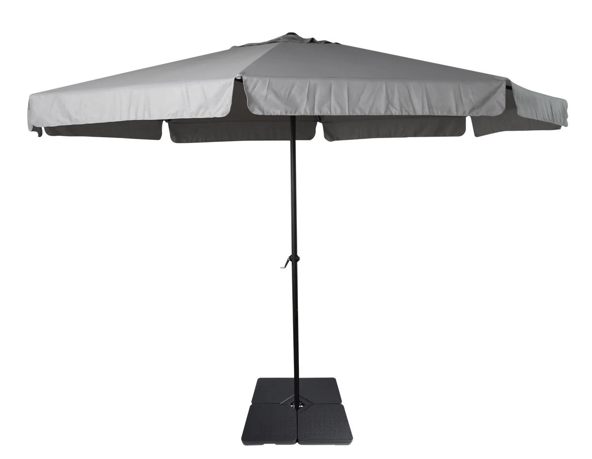 Fabric: H23 PolyesterFeatures: With Air Vent, with FlapSteel Pole: φ50*1.0mmRibs: 8 steel ribsSize:Pole: 17270.5mmCoating: Powder CoatingOperation: Crank Open and Close MechanismBase: Cross Base with Fillable Patio Umbrella Base