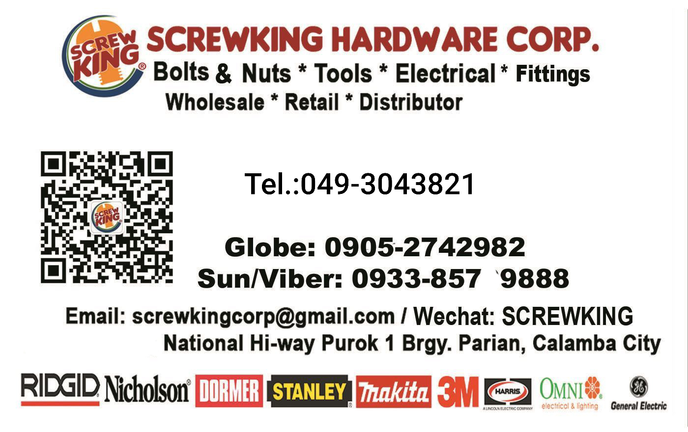 Screwking Hardware CorporationOne Stop Shop of Bolts & Nuts ; Machines Tools ; Power tools ; Electrical Supply and Etc.Manufacturer: Unlistore SKU: ScrewkingCall for pricing Ship toSelect countryPhilippinesAustraliaCanadaChinaHong KongJapanMalaysiaSingaporeTaiwanUnited Arab EmiratesUnited KingdomUnited StatesUnited States of AmericaAfghanistanÅland IslandsAlbaniaAlgeriaAmerican SamoaAndorraAngolaAnguillaAntarcticaAntigua and BarbudaArgentinaArmeniaArubaAustraliaAustriaAzerbaijanBahamasBahrainBangladeshBarbadosBelarusBelgiumBelizeBeninBermudaBhutanBolivia (Plurinational State of)Bonaire, Sint Eustatius and SabaBosnia and HerzegovinaBotswanaBouvet IslandBrazilBritish Indian Ocean TerritoryBrunei DarussalamBulgariaBurkina FasoBurundiCabo VerdeCambodiaCameroonCanadaCayman IslandsCentral African RepublicChadChileChinaChristmas IslandCocos (Keeling) IslandsColombiaComorosCongoCongo (Democratic Republic of the)Cook IslandsCosta RicaCôte d'IvoireCroatiaCubaCuraçaoCyprusCzechiaDenmarkDjiboutiDominicaDominican RepublicEcuadorEgyptEl SalvadorEquatorial GuineaEritreaEstoniaEswatiniEthiopiaFalkland Islands (Malvinas)Faroe IslandsFijiFinlandFranceFrench GuianaFrench PolynesiaFrench Southern TerritoriesGabonGambiaGeorgiaGermanyGhanaGibraltarGreeceGreenlandGrenadaGuadeloupeGuamGuatemalaGuernseyGuineaGuinea-BissauGuyanaHaitiHeard Island and McDonald IslandsHoly SeeHondurasHong KongHungaryIcelandIndiaIndonesiaIran (Islamic Republic of)IraqIrelandIsle of ManIsraelItalyJamaicaJapanJerseyJordanKazakhstanKenyaKiribatiKorea (Democratic People's Republic of)Korea (Republic of)KuwaitKyrgyzstanLao People's Democratic RepublicLatviaLebanonLesothoLiberiaLibyaLiechtensteinLithuaniaLuxembourgMacaoMadagascarMalawiMalaysiaMaldivesMaliMaltaMarshall IslandsMartiniqueMauritaniaMauritiusMayotteMexicoMicronesia (Federated States of)Moldova (Republic of)MonacoMongoliaMontenegroMontserratMoroccoMozambiqueMyanmarNamibiaNauruNepalNetherlandsNew CaledoniaNew ZealandNicaraguaNigerNigeriaNiueNorfolk IslandNorth MacedoniaNorthern Mariana IslandsNorwayOmanPakistanPalauPalestine, State ofPanamaPapua New GuineaParaguayPeruPhilippinesPitcairnPolandPortugalPuerto RicoQatarRéunionRomaniaRussian FederationRwandaSaint BarthélemySaint Helena, Ascension and Tristan da CunhaSaint Kitts and NevisSaint LuciaSaint Martin (French part)Saint Pierre and MiquelonSaint Vincent and the GrenadinesSamoaSan MarinoSao Tome and PrincipeSaudi ArabiaSenegalSerbiaSeychellesSierra LeoneSingaporeSint Maarten (Dutch part)SlovakiaSloveniaSolomon IslandsSomaliaSouth AfricaSouth Georgia and the South Sandwich IslandsSouth SudanSpainSri LankaSudanSurinameSvalbard and Jan MayenSwedenSwitzerlandSyrian Arab RepublicTaiwan, Province of ChinaTajikistanTanzania, United Republic ofThailandTimor-LesteTogoTokelauTongaTrinidad and TobagoTunisiaTurkeyTurkmenistanTurks and Caicos IslandsTuvaluUgandaUkraineUnited Arab EmiratesUnited Kingdom of Great Britain and Northern IrelandUnited States Minor Outlying IslandsUruguayUzbekistanVanuatuVenezuela (Bolivarian Republic of)VietnamVirgin Islands (British)Virgin Islands (U.S.)Wallis and FutunaWestern SaharaYemenZambiaZimbabwe *Other *Shipping MethodNameEstimated DeliveryPriceNo shipping optionsApply Custom wishlist OKAdd to wishlistAdd to compare listEmail a friendWE ARE SPECIAL ON LIST BELOW1. Bolts and Nuts2.Tools And Power Tools3. Industrial Equipment4. Safty Protection5. Security Products6. Construction Materials7. Light and Electrical Supplywebsite: https://www.screwking.phEmail Address : Screwkingcorp@gmail.comTelephone: 049-3043821Sun / Viber : 0933-8579888Store Address at Calamba Pension Plaza National H-way Brgy. Parian Calamba Laguna